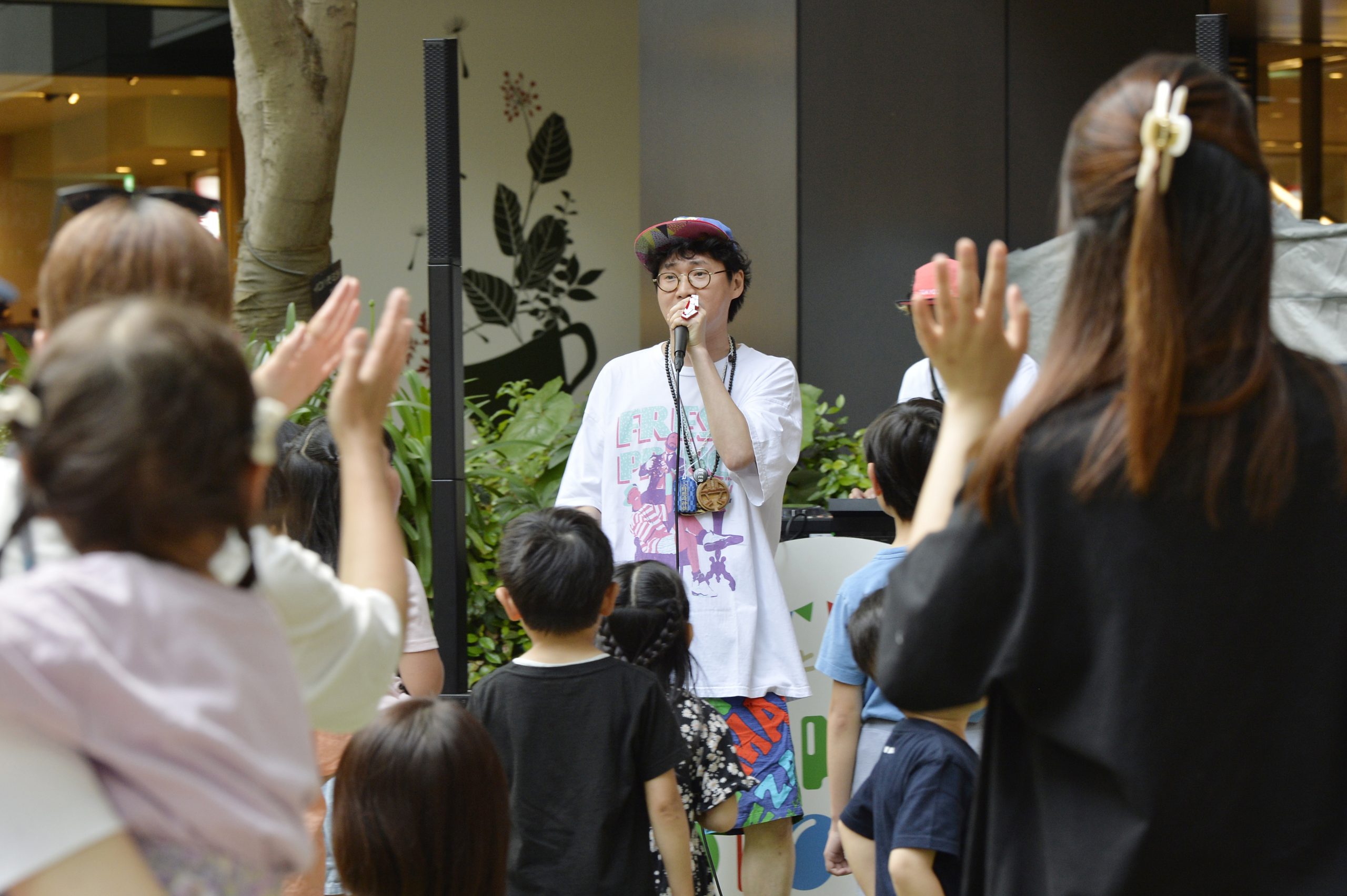 そんななか、「ドーナッツ」の掛け声とともに可愛いラップを口ずさみながら登場したのはラッパー・マチーデフさん。お子様とリラックスしたコミュニケーションを取りながら、しりとりで身近な言葉を集め、それらを綴ることで一つのラップナンバーを即興で創り上げました。自分が発した言葉がラップに変換されるという不思議な体験を通じて、多くのお子様がラップという未知なるものに一気に引き寄せれていく様子が見られました。