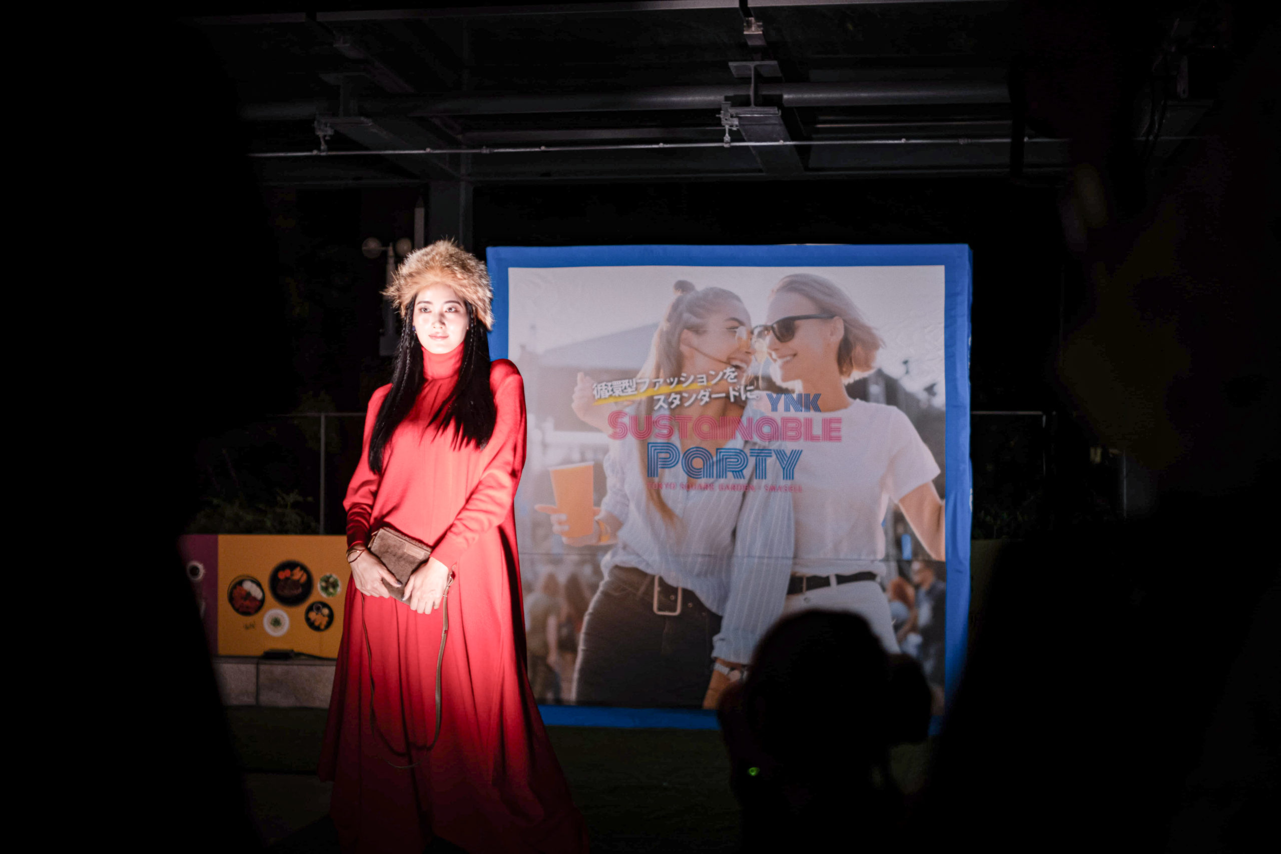 Sustainable Party1日目、金曜よる7時。オフィスビル足元の広場で突如始まったランウェイに、周辺のビルから退勤した会社員や外国人観光客らが足をとめ、闇夜に浮かぶように照らされた、古着ファッションに身を包んだモデルたちを写真におさめていました。