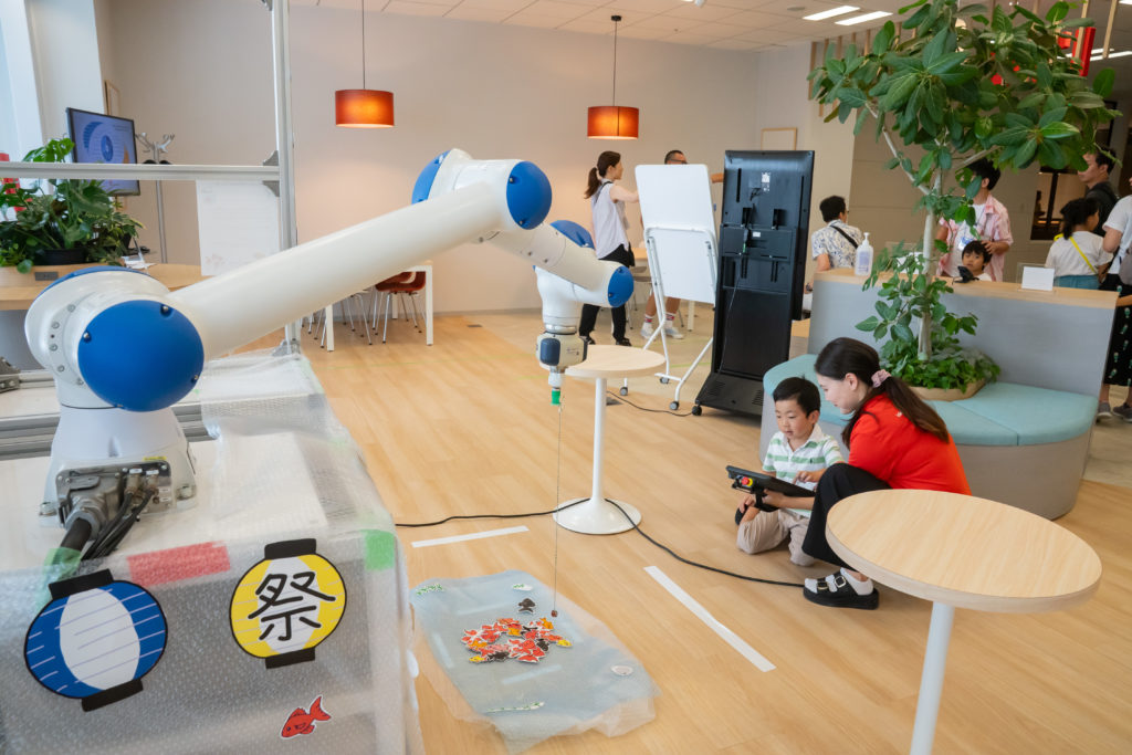 同じ6階にある産業機械の専門商社 伊東商会を覗くと、実際に工場などで使われるロボットアームを使った魚釣り体験にこども達は夢中な様子。「12匹も釣れたよー!」と上手に操作し、たくさんの魚を釣り上げたお子さんには、ほかのご家族からも拍手が起こっていました。