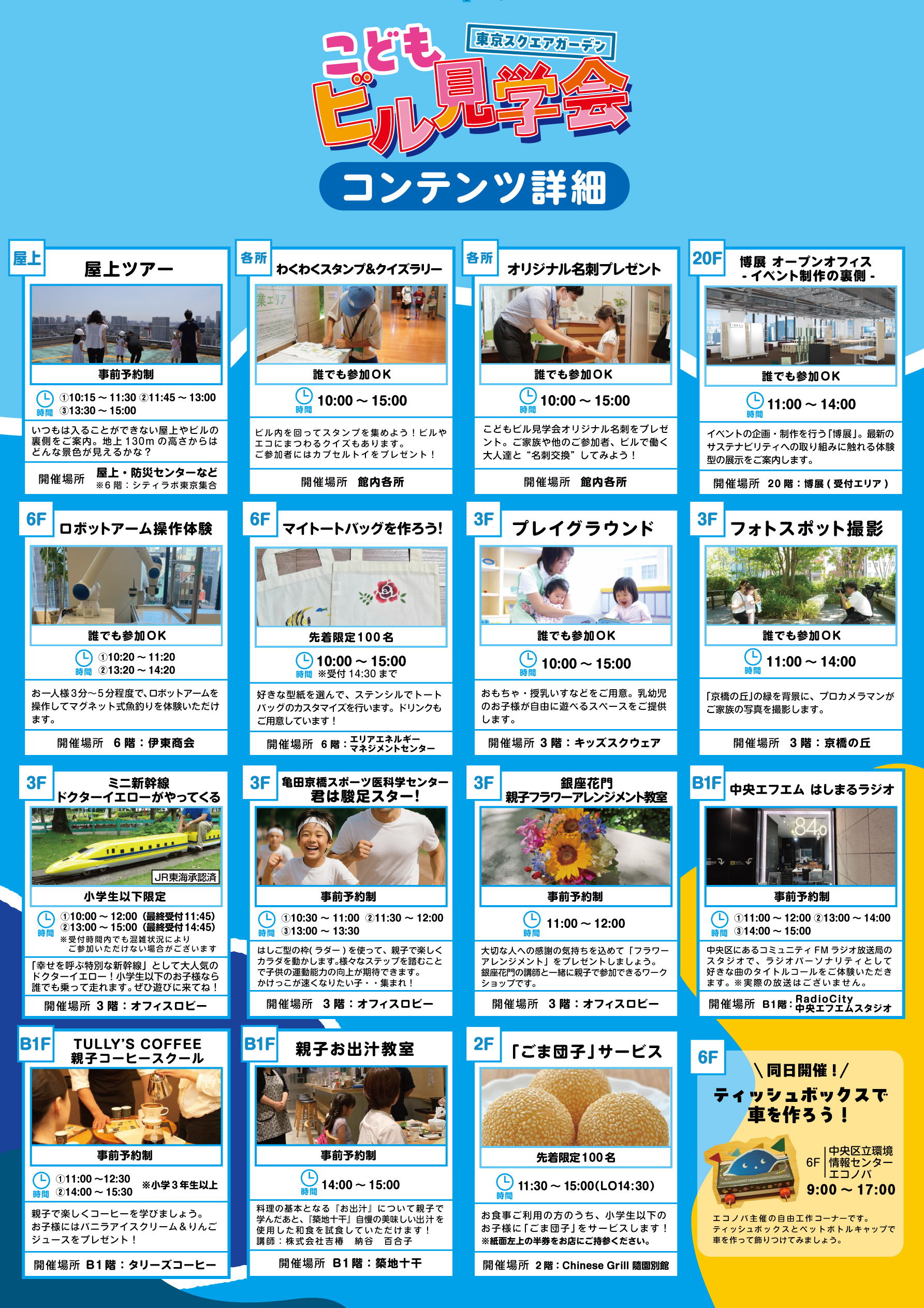 夏休み終盤の8月23日(土)、東京スクエアガーデンにお勤めの方とそのご家族を対象とした「こどもビル見学会」を開催しました。昨年に続いての開催となった今年は、さらにコンテンツが増え、より充実したイベントにバージョンアップ。68組200名以上のご家族にご参加いただきました。