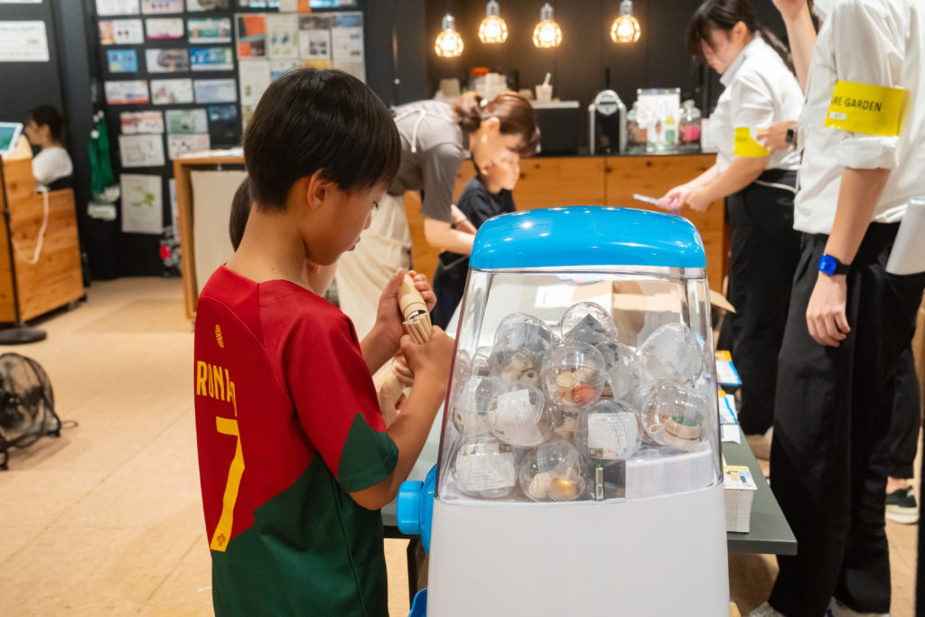 ビル内のチェックポイントでスタンプを集めたこども達には、木製のコマなど環境に配慮して作られた雑貨が入ったカプセルトイをプレゼント。「コマを回してみよう!」と早速カプセルを開け、その場で遊ぶ姿も見られました。
