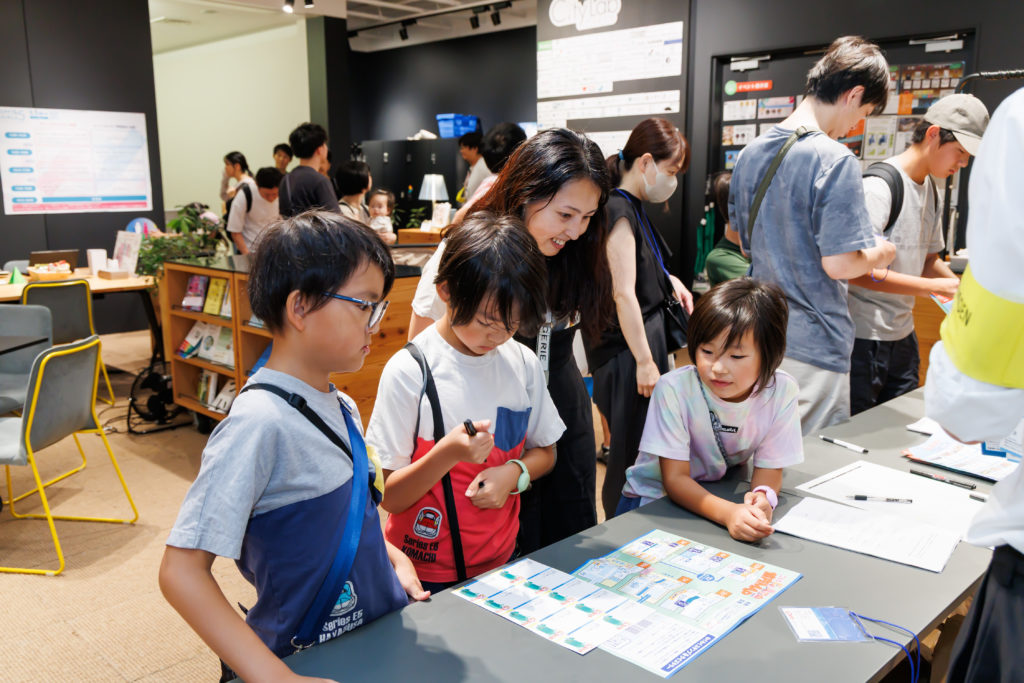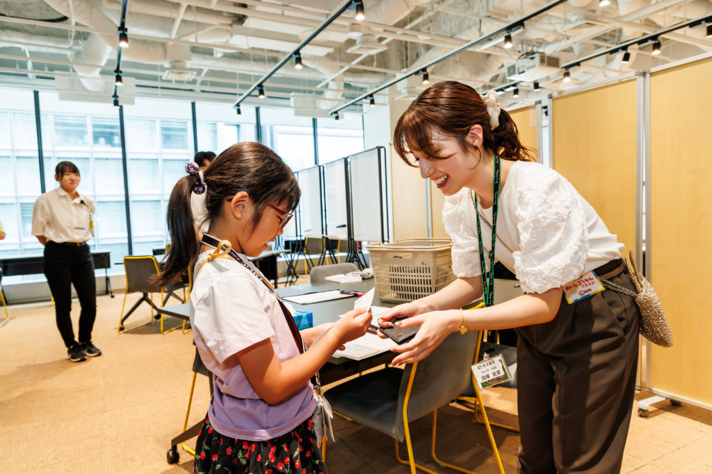 参加者はまず、6階の「シティラボ東京」で受付をし、スタンプ&クイズラリー用の館内マップを受け取ります。こども達にはオリジナル名刺を配布。参加者同士はもちろん、館内のビルで働く大人たちとも自由に名刺交換することができます。