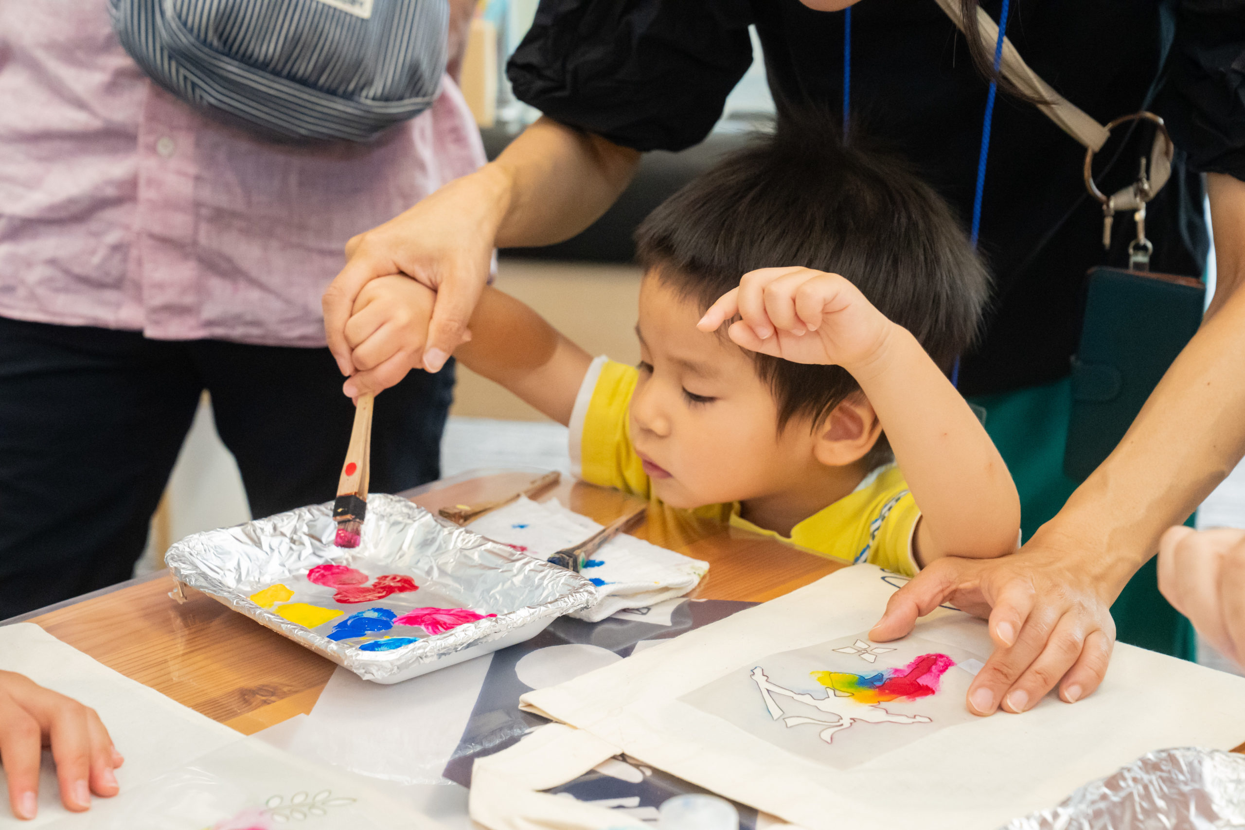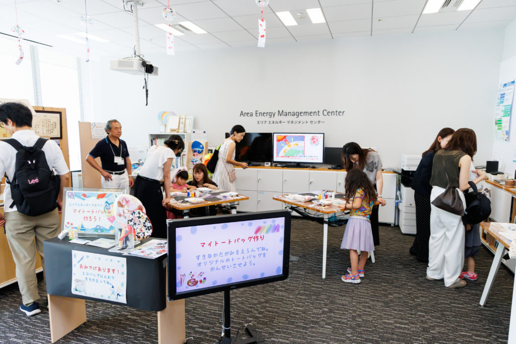 ビルの省エネ診断、省エネ相談などを行うエリアエネルギーマネジメントセンターでは、好きな型紙を選び、ステンシルで思い思いに色付けするオリジナルトートバッグ作りが行われており、こども達のオリジナリティあふれるカラーリングのバッグが次々に完成していました。