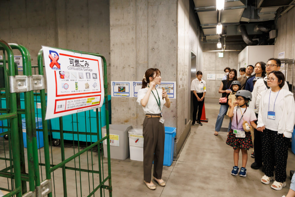 屋上ツアー最後の回では、ビルから排出されるごみが集まるごみ置き場を見学。細かくごみが分別されていることや、生ごみ処理機が設置されていることなど、環境に配慮したさまざまな取り組みがされているという説明に、参加者のみなさんは熱心に耳を傾けていました。