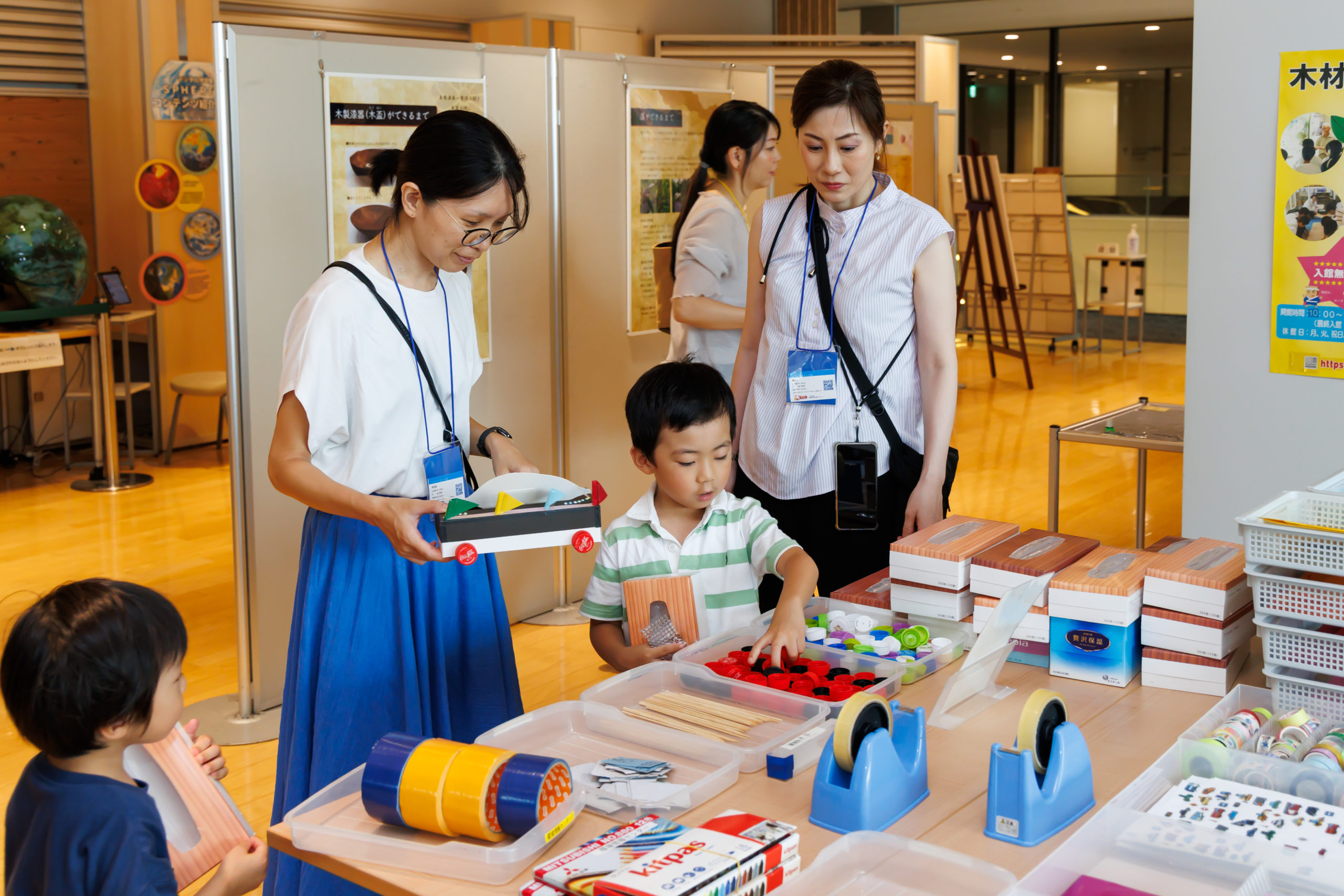 お隣の環境情報の発信と環境活動の機会と場を提供する中央区立環境情報センター「エコノバ」は、スタンプ&クイズラリーのチェックポイントを設置。またこちらでは毎月第2、第4土曜日にエコな自由工作コーナーを開催しており、この日の工作は「ティッシュボックスで車を作ろう!」。多くのこども達が立ち寄り、工作に熱中していました。