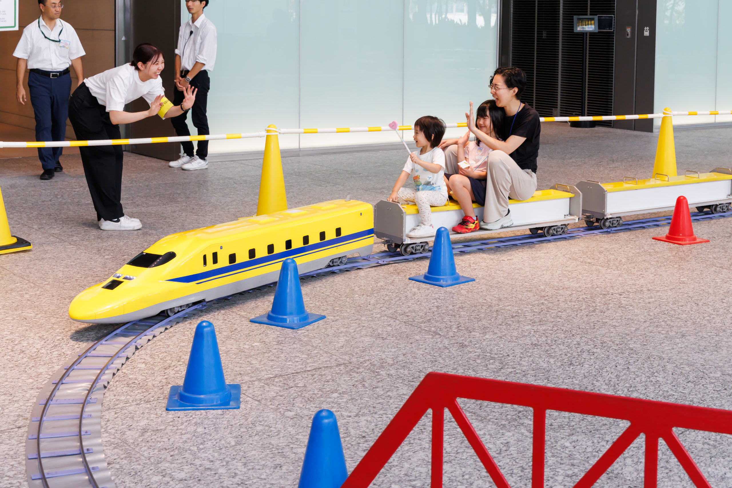 3つのコンテンツが行われていたのが、3階オフィスロビー。まず目を引いたのが「幸せを呼ぶ特別な新幹線」として大人気のドクターイエロー。ミニ新幹線に乗って線路をぐるりと2周でき、楽しそうに手を振るこども達の声が響いていました。