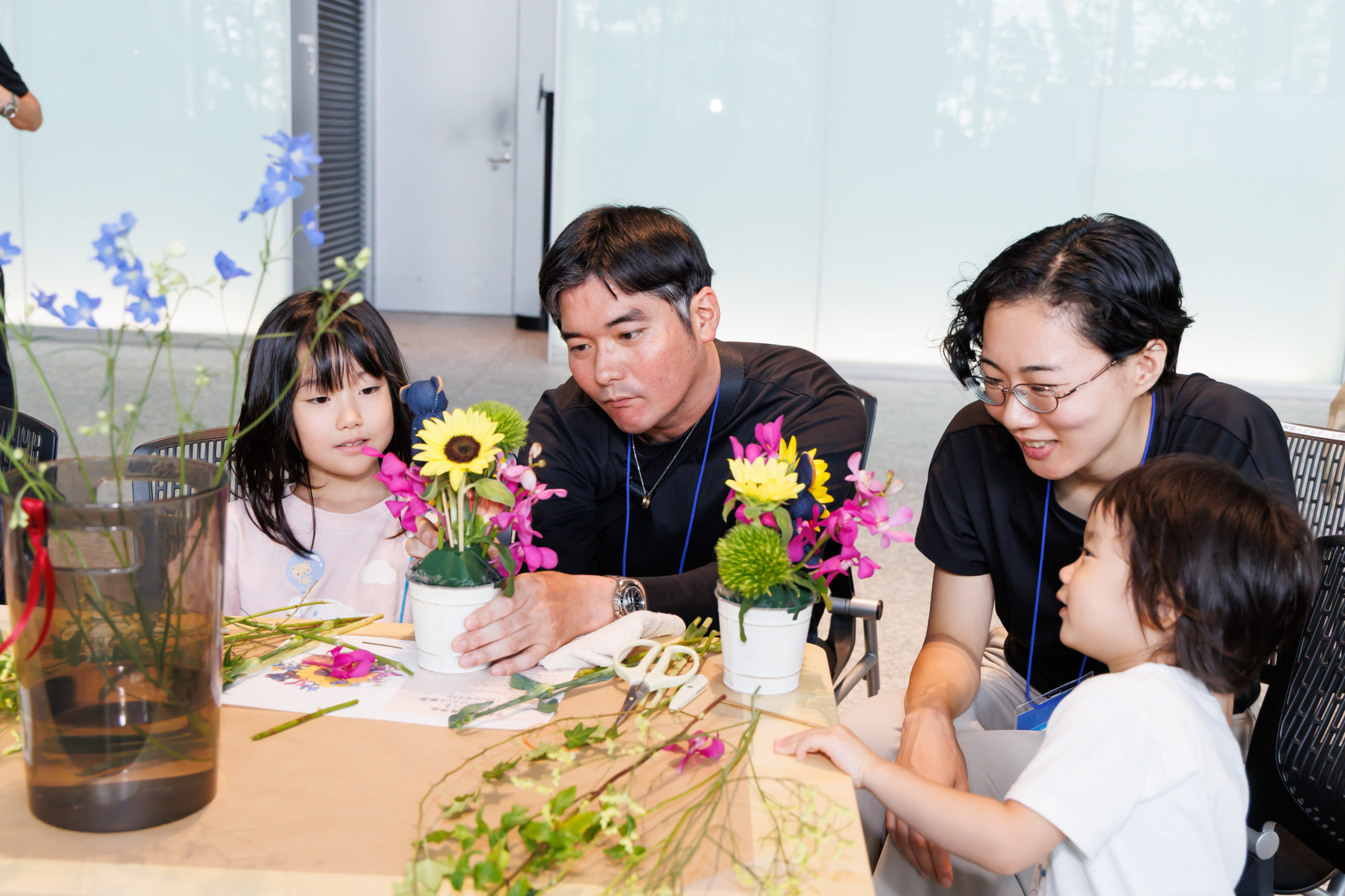 フラワーアレンジメント教室では、季節の花とかわいい動物のピックを使ったアレンジメントを親子で協力しながら仕上げていました。完成品はラッピングをもらい、「少し難しかったけど、きれいにできました」「私(母)がやりたくて申し込みましが、一緒にできていい記念になりました」と親子で大事そうに持ち帰る姿が印象的でした。